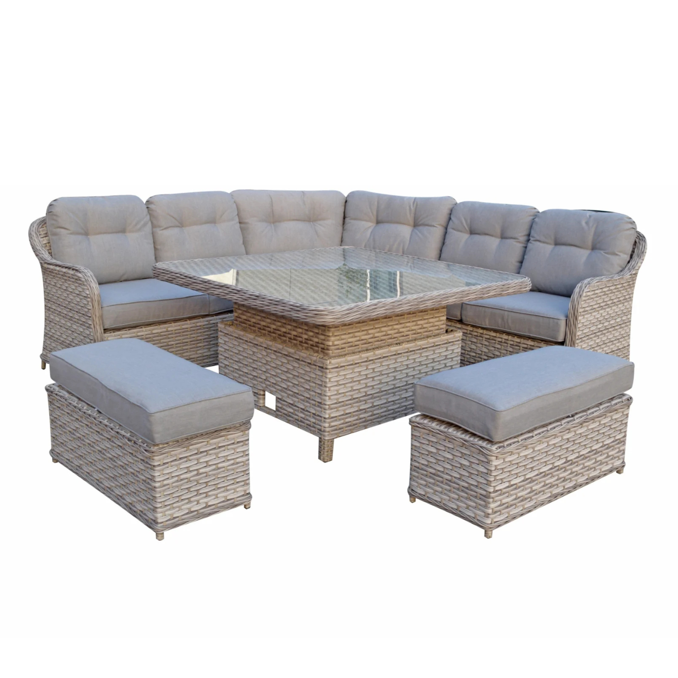 Transform your outdoor space into a stylish and functional retreat with this versatile corner dining set. Designed for both relaxation and entertaining, this modular 8-piece set includes a spacious L-shaped corner sofa, a large square rising dining table, and two cushioned benches that double as extra seating or footrests.