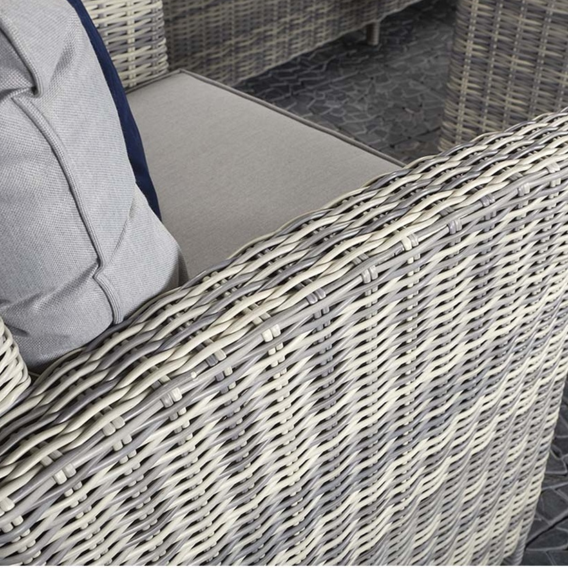Crafted from durable, weather-resistant synthetic rattan in a light grey weave, this set is ideal for all-season outdoor use.