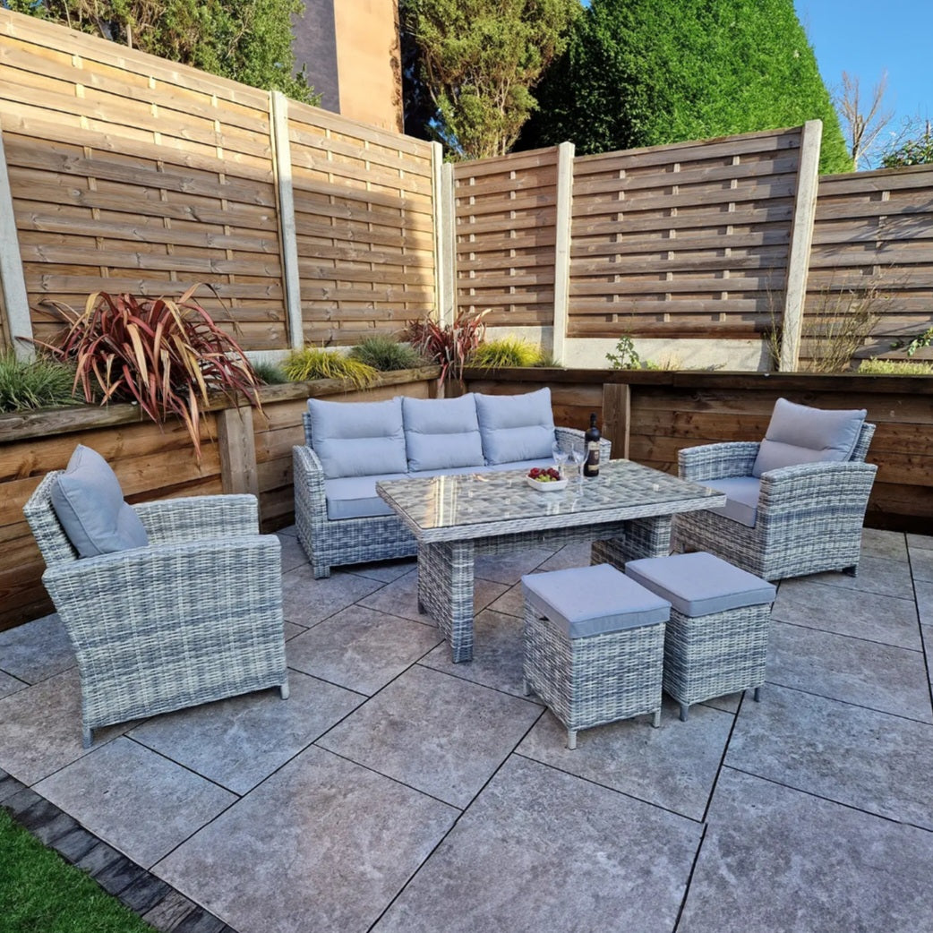Bring both style and practicality to your outdoor space with this contemporary garden dining set, designed for comfort, versatility, and elegance. This beautifully coordinated set includes a spacious three-seater sofa, two generous armchairs, two compact cushioned stools, and a large rectangular dining table with a tempered glass top.